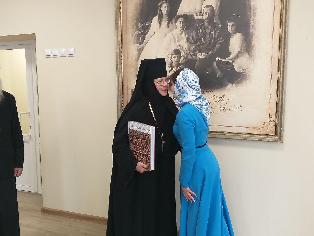 Краткая экскурсия по школе, завершилась в прекрасном актовом зале. Там прибывшие с дружеским паломническим визитом из Санкт-Петербурга – директор Школы народного искусства императрицы Александры Федоровны Юлия Николаевна Загорская и руководитель мастерской кружевоплетения, заведующая школьным музеем Елена Константиновна Александрова вручили матушке Евстолии для гимназии большую книгу репродукций Ильи Глазунова.